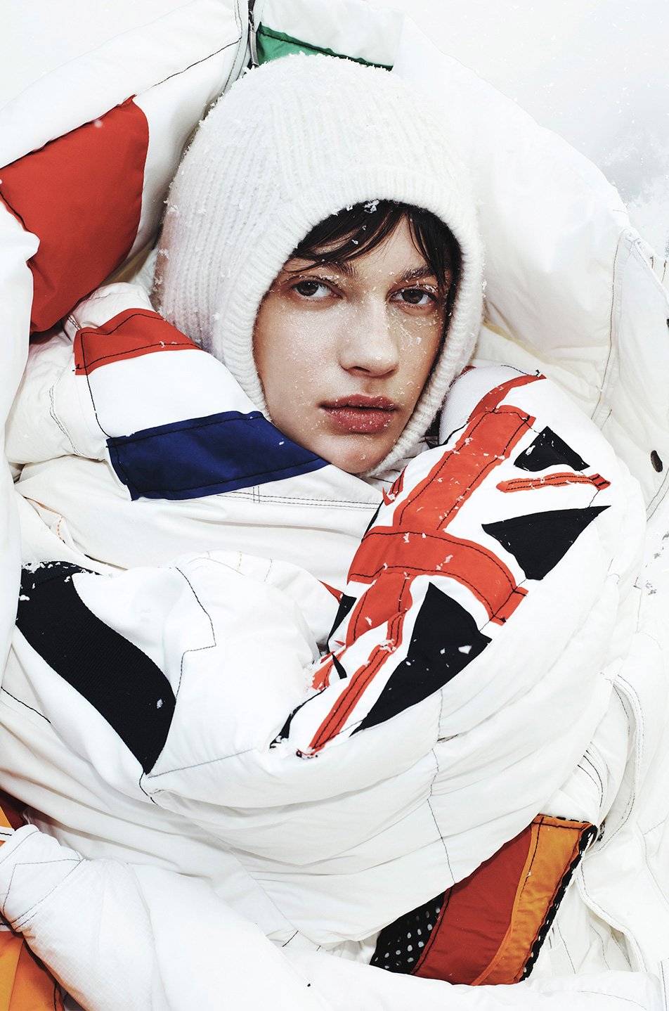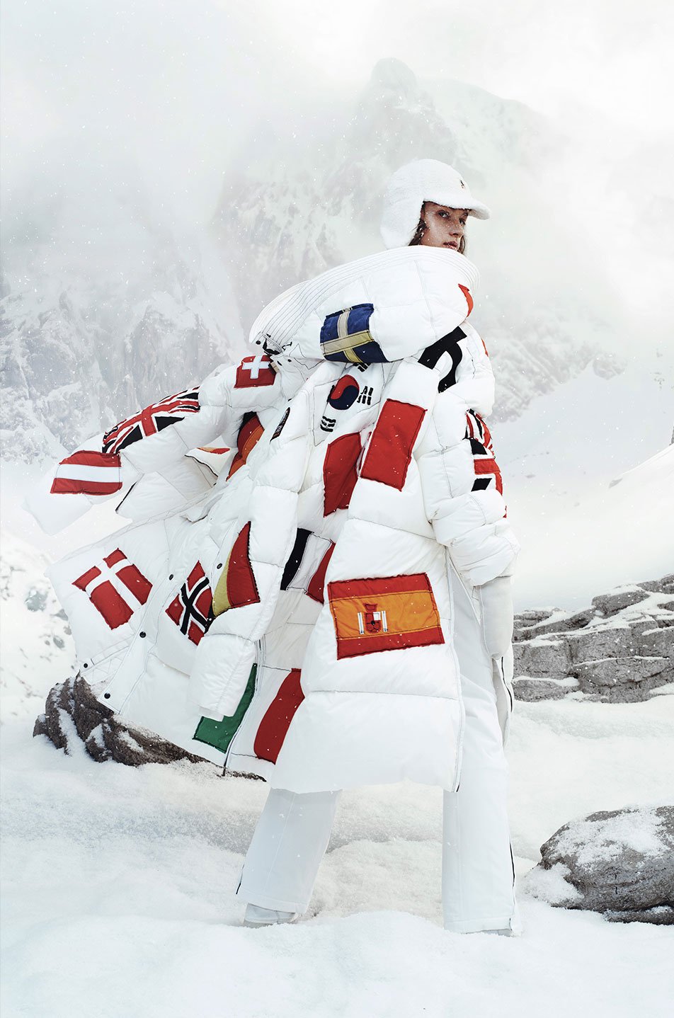 The long puffer is crafted in striking pure white nylon taffeta and insulated with a 90/10 down fill. Its defining element is an array of hand-stitched flags, each representing a nation united by the same winter spirit. A clean, powerful silhouette turns symbolism into a statement piece designed to be both meaningful and wearable.